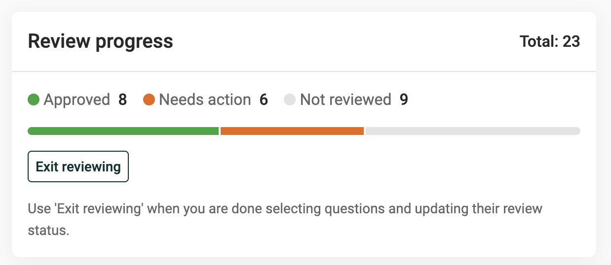 När du är klar med att uppdatera granskningsstatusen för flera frågor klickar du på Avsluta granskning i rutan Granskningsförlopp.