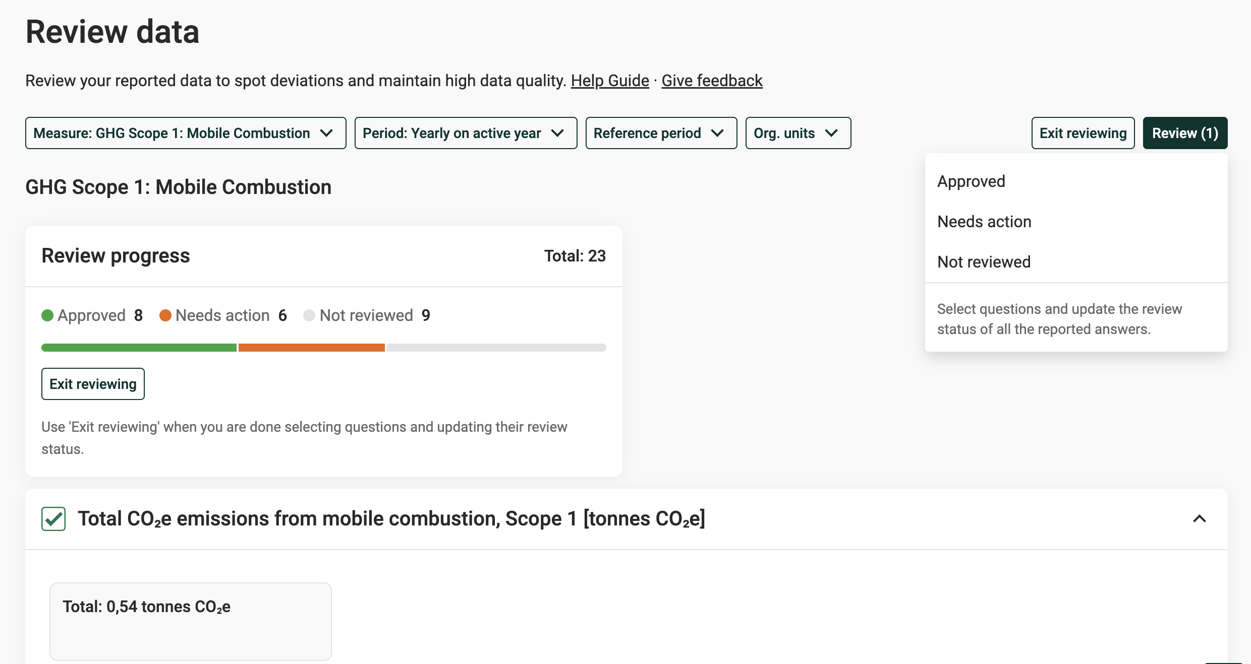 - Granska datapunkter – För att bättre hålla reda på vilka datapunkter du eller dina kollegor har granskat, klicka på knappen Granska och markera en datapunkt som Godkänd eller Behöver åtgärder.